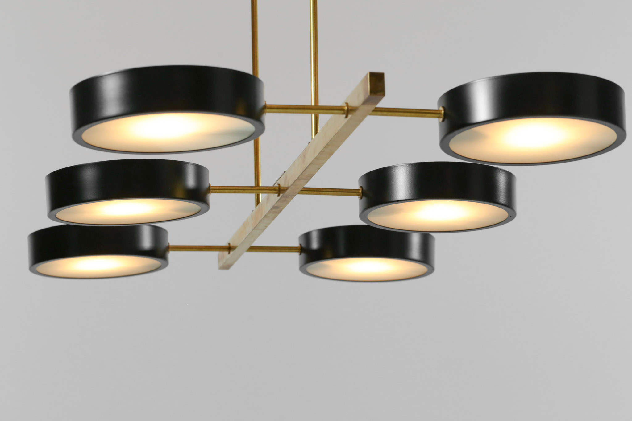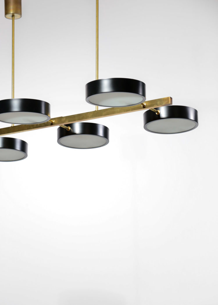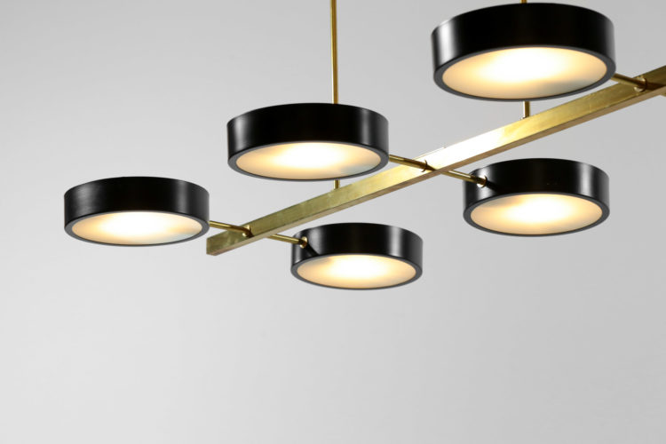 Grand lustre moderne italien six diffuseurs dans l’esprit du Designer danois Hans Agne Jakobsson. Structure en laiton massif, diffuseurs cerclés en laiton laqué noir et disque en verre dépoli. Six ampoules type E14.
