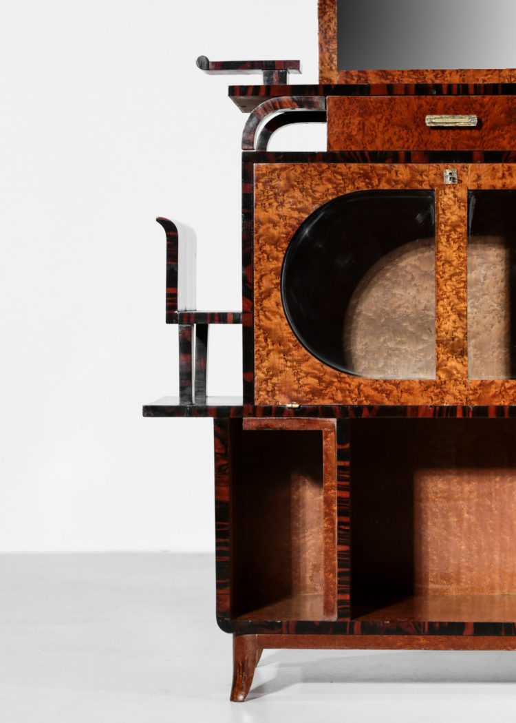 Meuble moderniste des années 40 attribué à Osvaldo Borsani et dans le goût du travail plus tardif du Designer Italien Ettore Sottsass. Structure en placage de palissandre de Rio, de bois de loupe et d’ébène de Macassar. Vernis entièrement restauré à la gomme laque. Quelques traces d’usages liées au temps. Meuble unique au Design rare et très décoratif surplombé de son miroir biseauté d’époque.