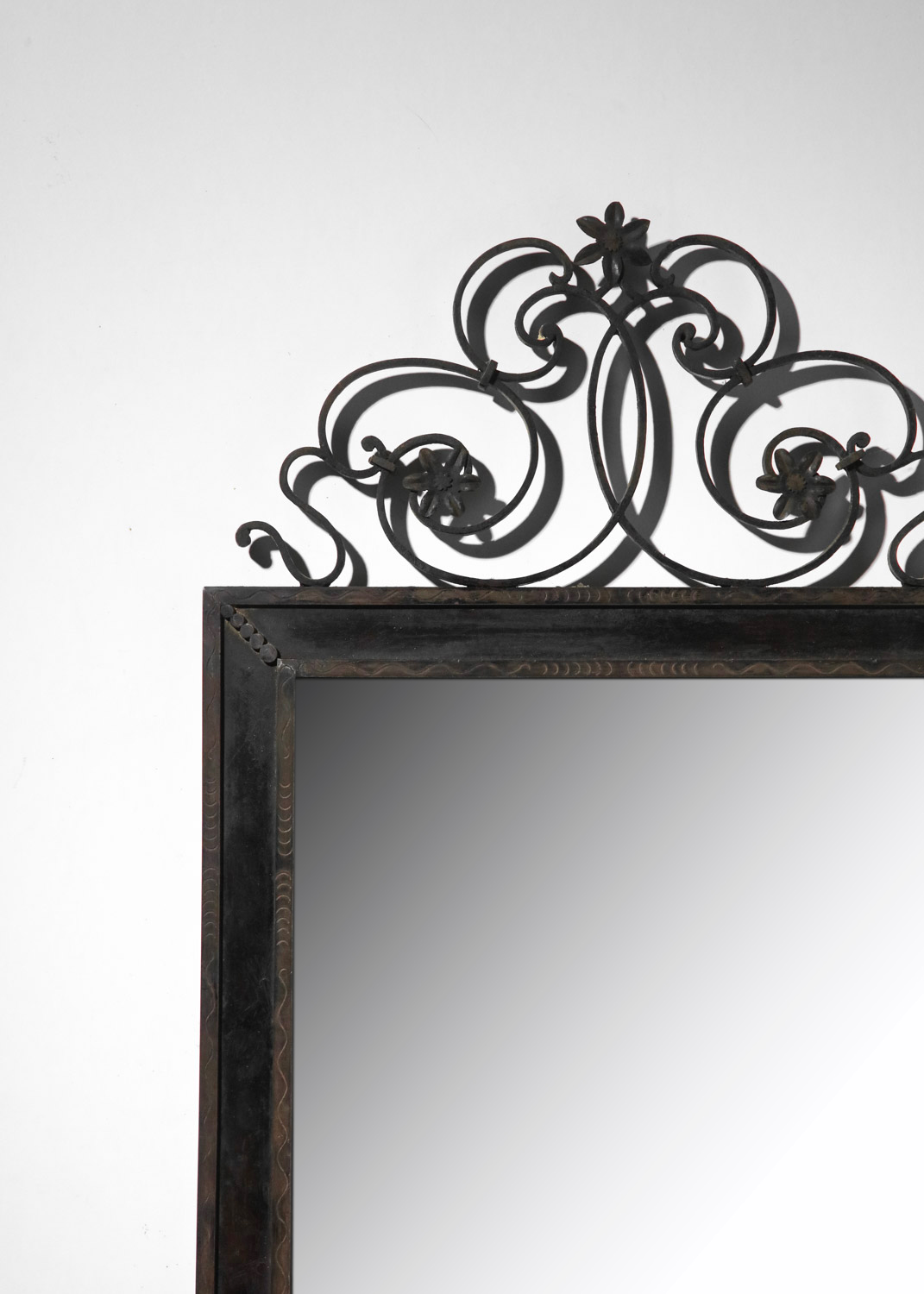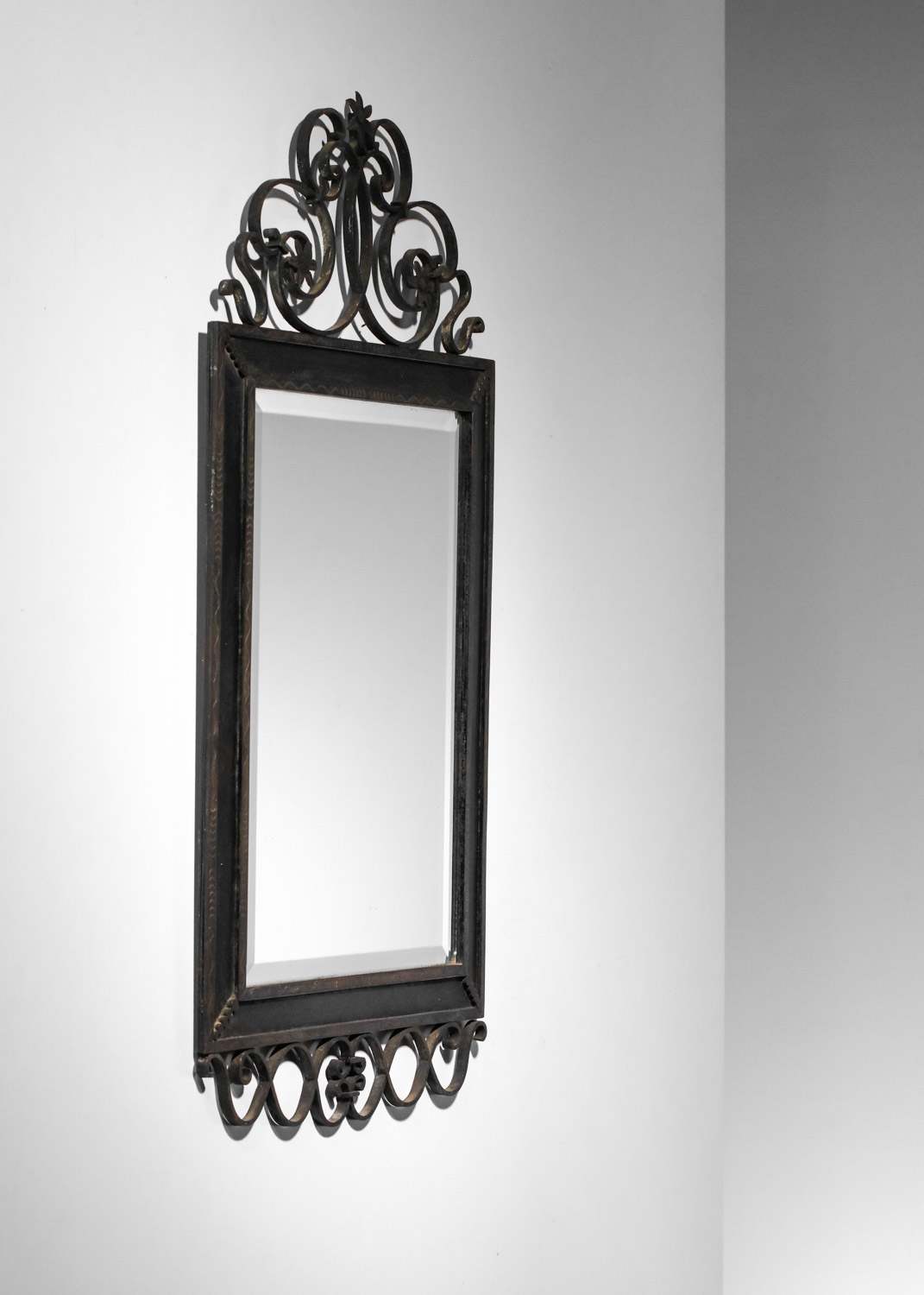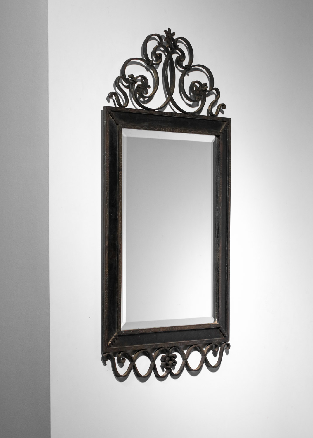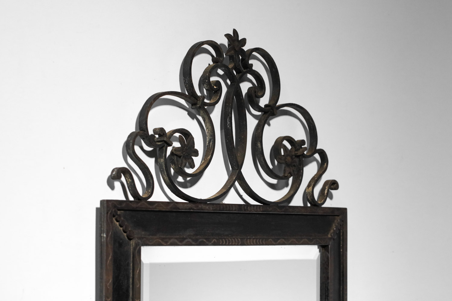 Grand miroir murale français des années 30. Structure en fer forgé laqué (peinture d’origine) décoré avec des fleurs et des volutes et gravée sur le cadre. Bel état vintage, avec une belle patine du temps que nous avons voulu garder en l’ état. Nombreuses traces du temps et d’oxydation sur l’ensemble du miroir (voir photos).