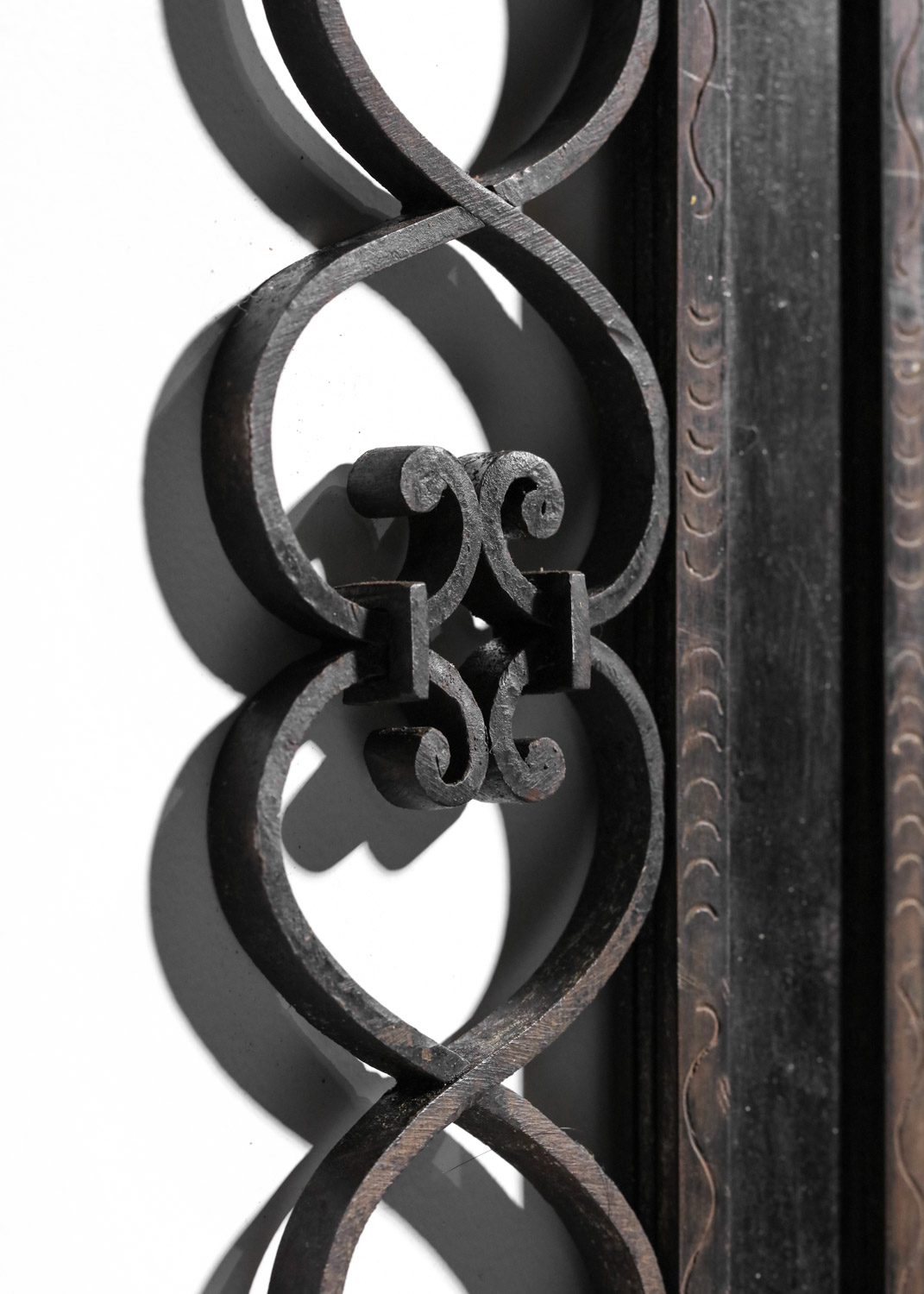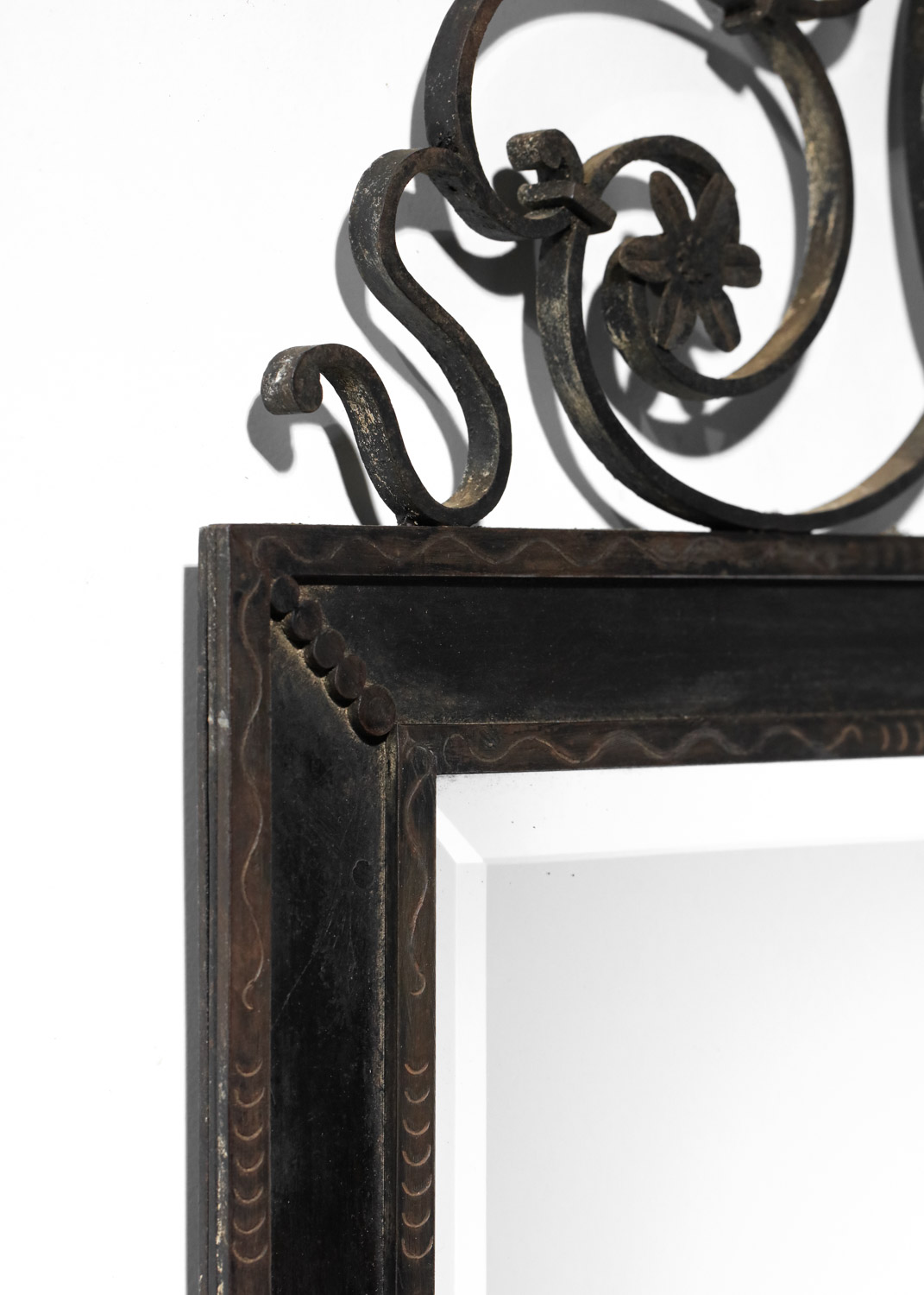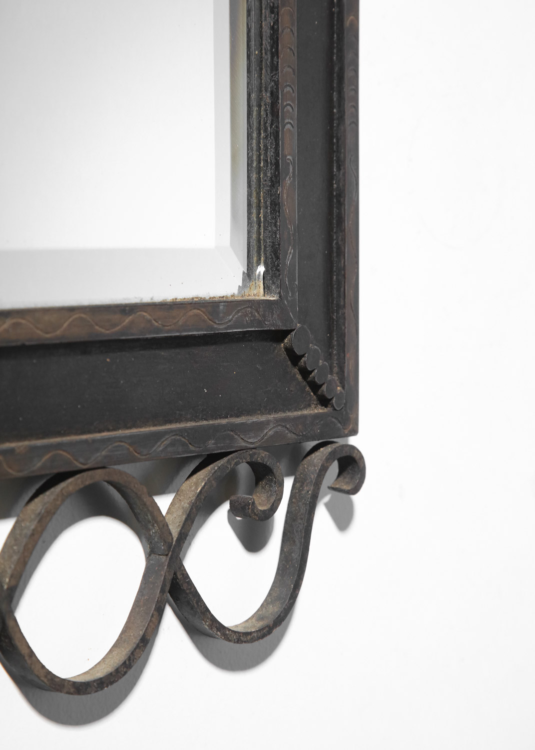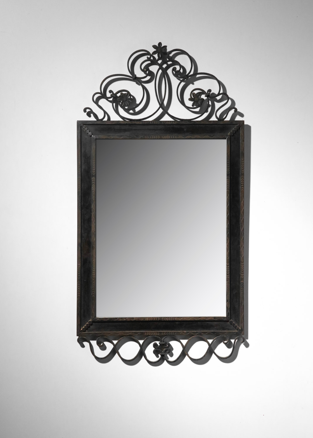 Grand miroir murale français des années 30. Structure en fer forgé laqué (peinture d’origine) décoré avec des fleurs et des volutes et gravée sur le cadre. Bel état vintage, avec une belle patine du temps que nous avons voulu garder en l’ état. Nombreuses traces du temps et d’oxydation sur l’ensemble du miroir (voir photos).