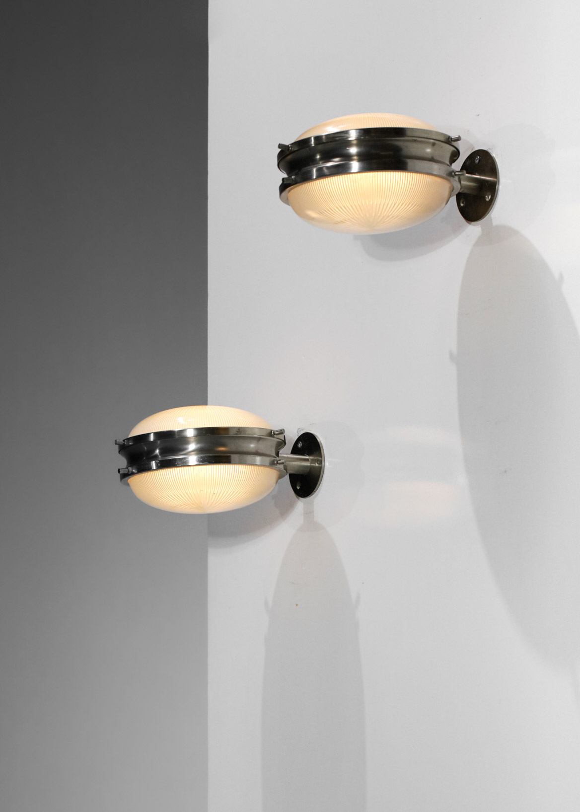 Paire d’appliques murales des années 60 du designer italien Sergio Mazza pour Artemide, modèle « Gamma ». Structure en laiton chromé et globes en verres dépolis blanc. Excellent état vintage (cf photos), ampoule LED recommandée de type E27.