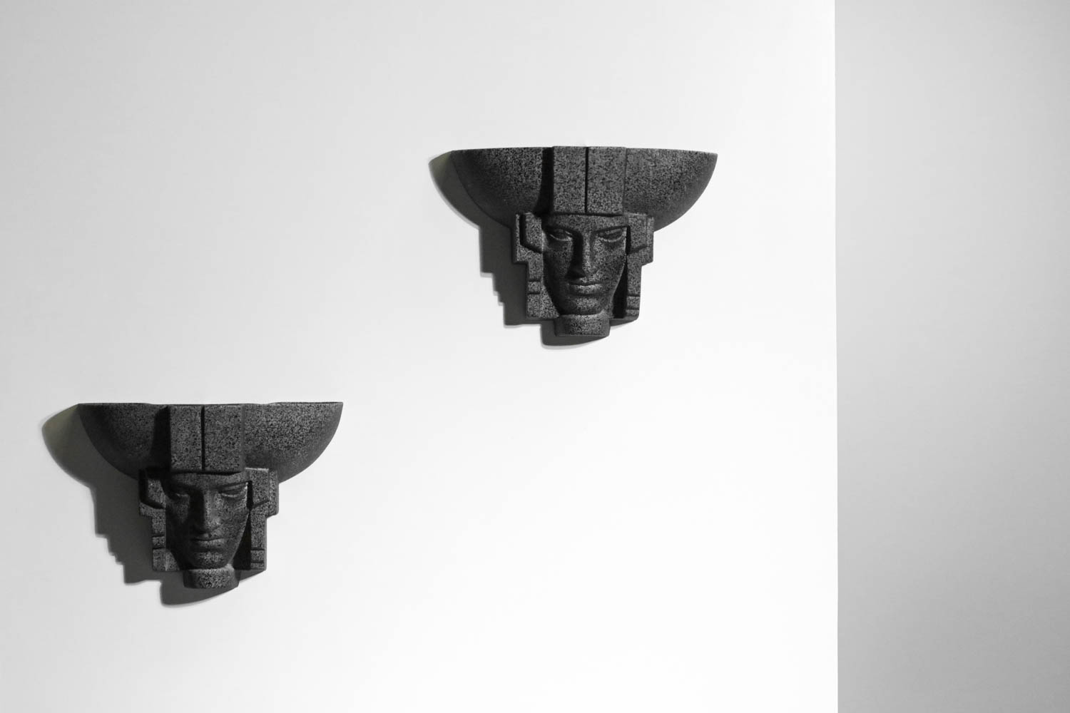 Paire d’appliques murales vintages françaises éditées par la maison Saint Clément dans les années 50/60. Modèle en faïence représentant un visage de femme dans un style art déco très décoratif et sculptural. Excellent état vintage (voir photos). Ampoule tube LED recommandée.