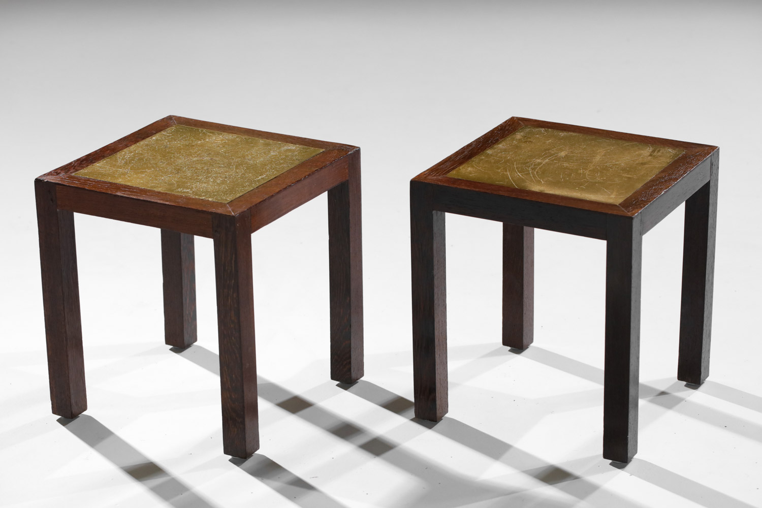 Paire de petites tables basses françaises des années 40. Structure des tables en bois de palmier massif avec une incrustation sur le plateau d’une feuille de laiton. Très bel état vintage du lot, à noter des traces d’utilisation (principalement des rayures) sur le laiton. Belle patine du temps sur le bois (cf photos).