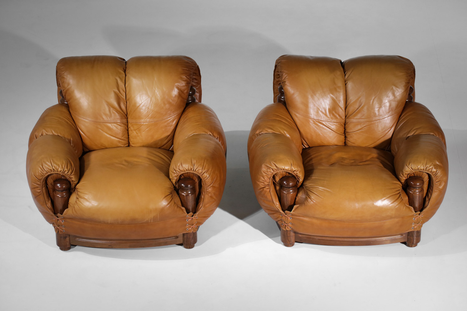 Paire de fauteuils italiens vintages des années 70. Structure en bois massif, assises et dossiers en cuir cognac. Forme et design assez original avec un beau détail de tressage dans les angles des fauteuils. Très bel état vintage du set avec une belle patine du temps sur le cuir (voir photos). `A noter des traces d’usage et du temps sur l’ensemble.