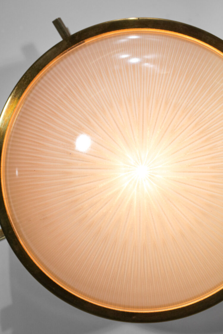 Paire d’appliques des années 60 du designer italien Sergio Mazza, modèle « Sigma ». Structure en laiton massif et globe en verre opaque. Ces appliques peuvent aussi être utilisées en plafonniers, excellent état vintage , ampoules LED recommandées de type E27 pour la grande applique et E14 pour la petite.