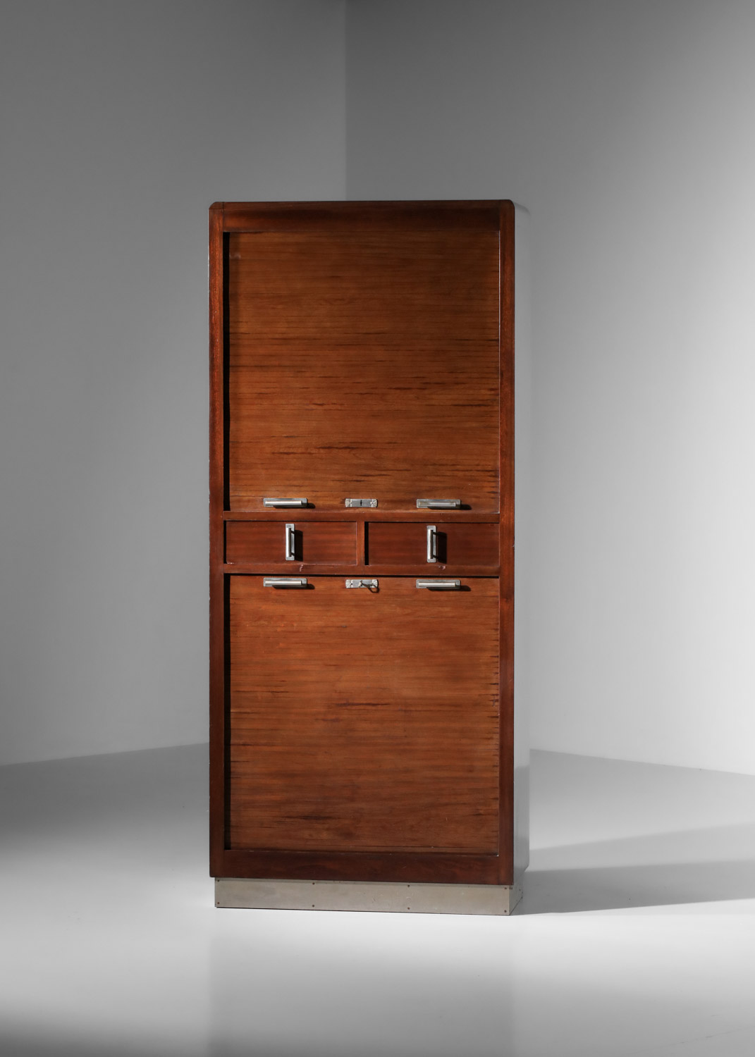 Paire d’armoires françaises modernistes des années 40. Structure en acajou massif et plaqué, poignées et serrure en laiton nickelé. Les meubles sont composés de deux rideaux coulissants ouvrant sur une série d’étagères et de deux tiroirs centraux. Design sobre et élégant. Bel état vintage, à noter des traces du temps et d’utilisation sur les deux armoires (accros, petite rayures etc etc), très belle patine du temps sur le bois (voir photos).