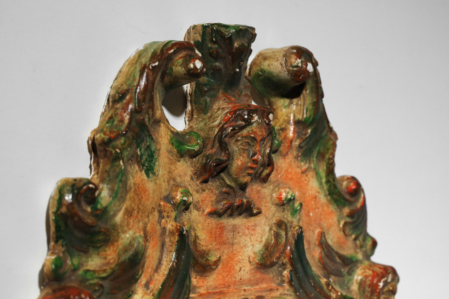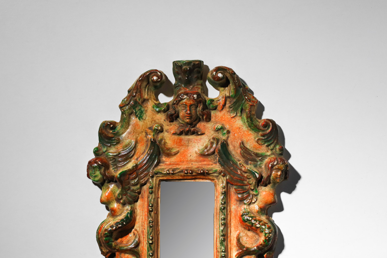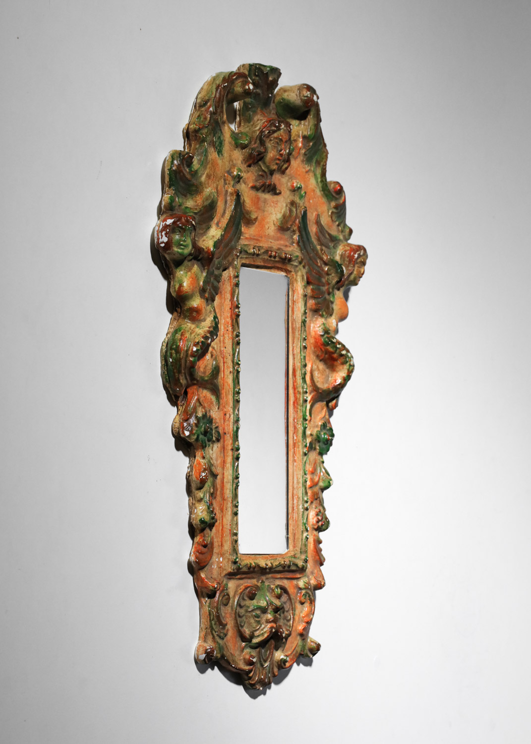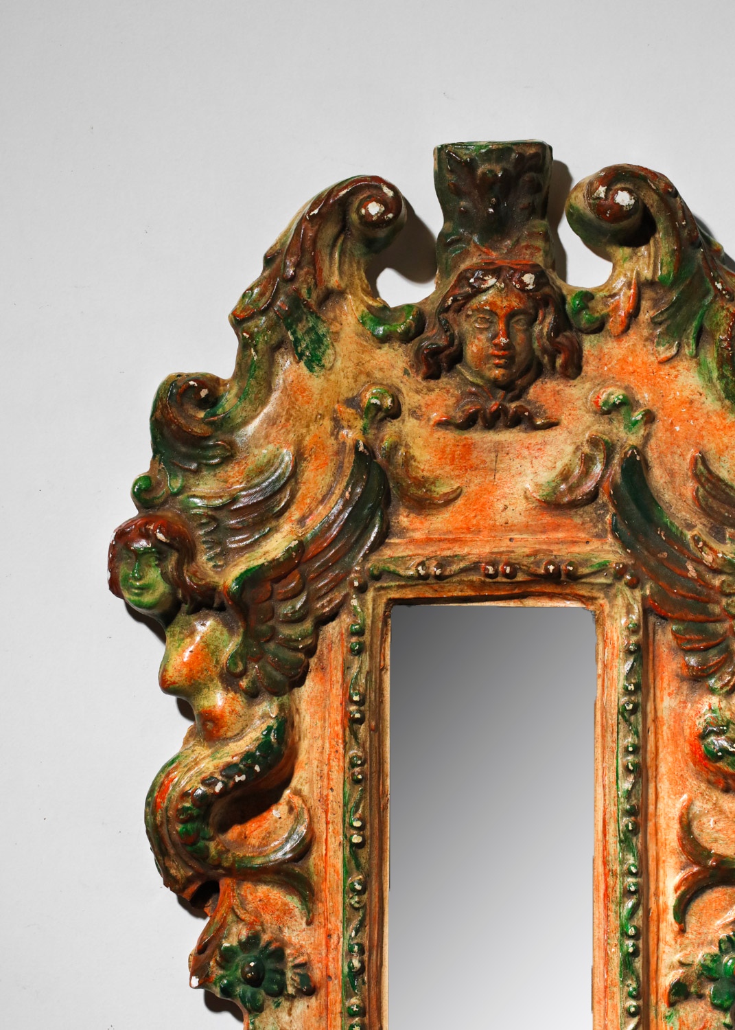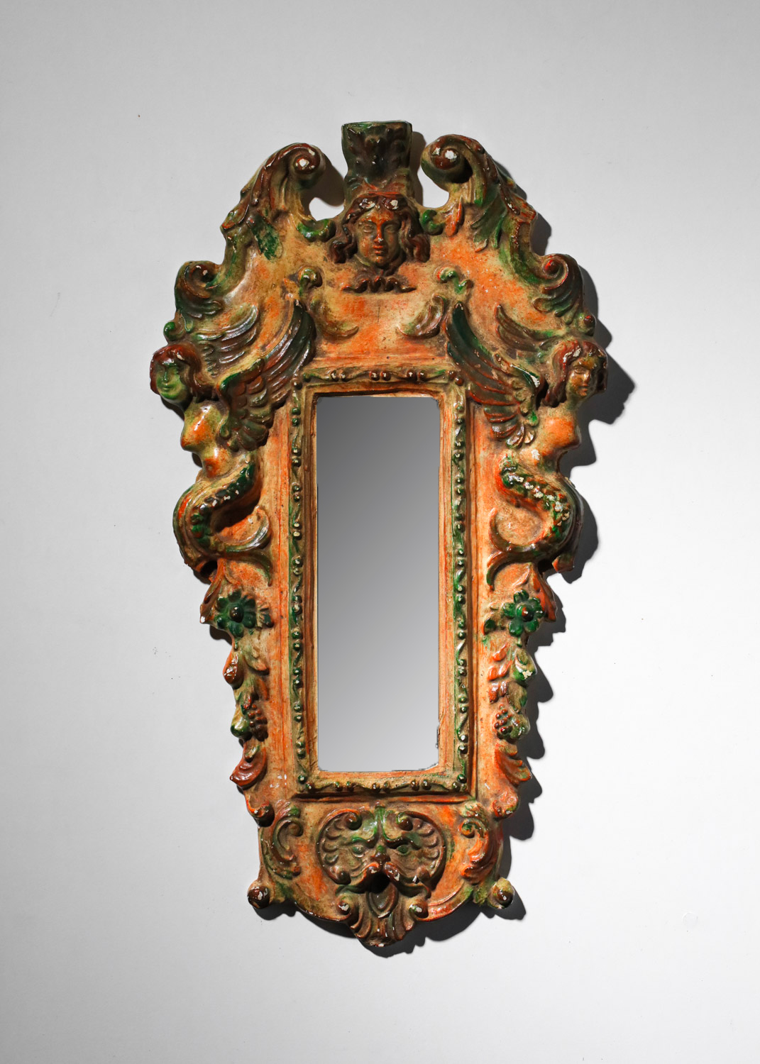 Petit miroir murale français en plâtre peint (peinture d’origine) représentant des sirènes avec un décor baroque tout autour du miroir. Patines dans des teintes organes et vertes. Nombreuses traces du temps et d’utilisations sur l’ensemble du miroir que nous avons souhaité conserver en l’état (CF photos).