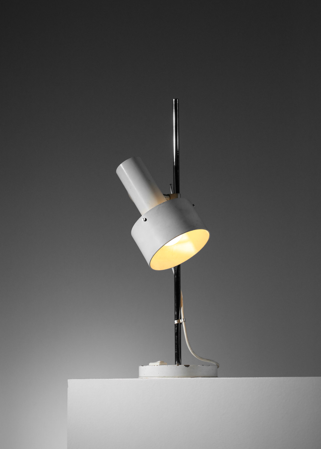 Lampe de table française des années 60 éditée par Diderot. Barre de fixation en métal chromé, abat-jour et socle en métal laqué blanc (peinture d’origine). Possibilité de régler la hauteur de l’abat-jour le long de la barre et de l’orienter dans différentes positions. Bel état vintage, à noter des traces du temps et d’utilisation sur l’ensemble de la lampe (voir photos). Système électrique d’origine, nous recommandons une ampoule LED type B22.