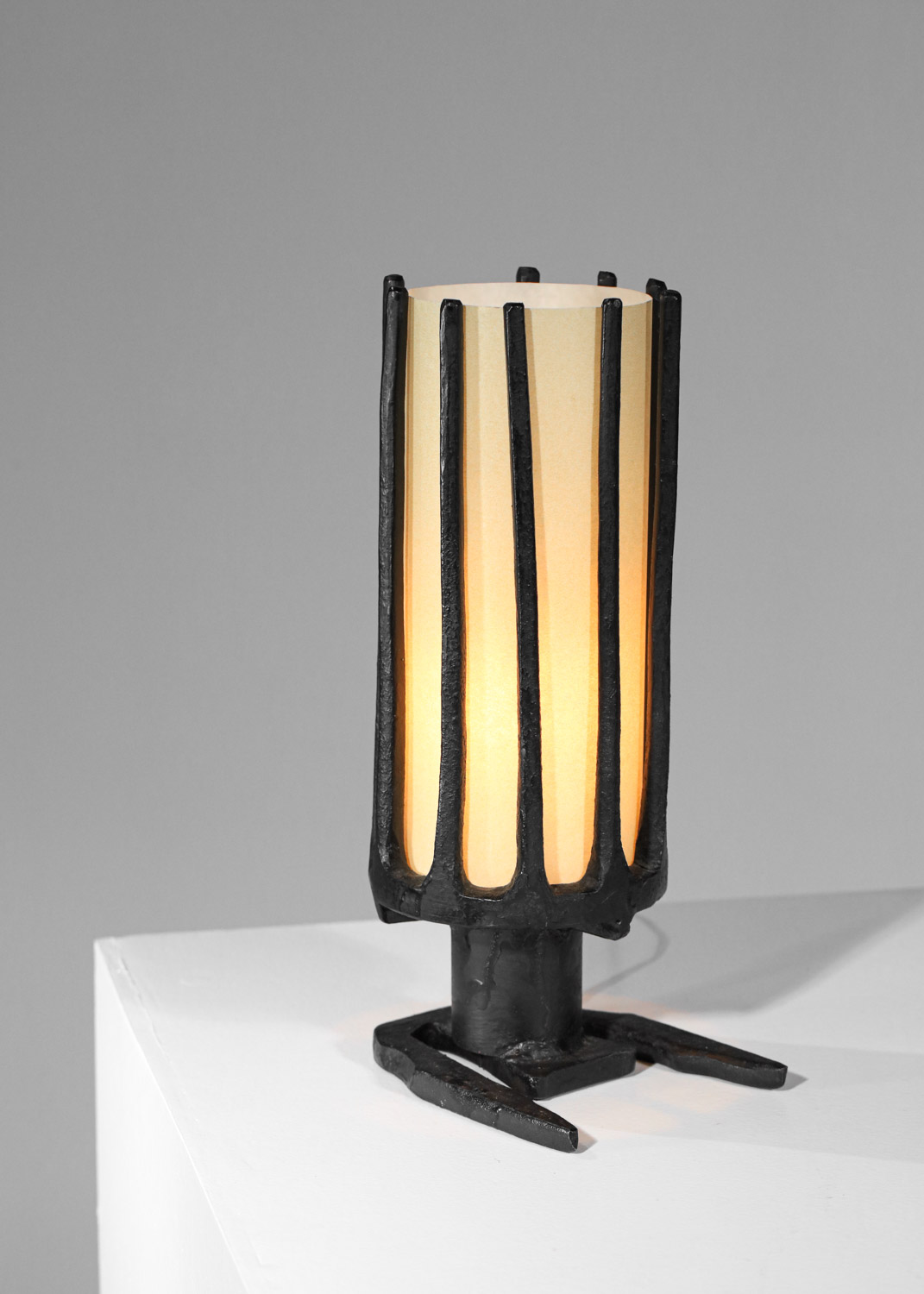 Lampe de table française des années 50/60 de style brutaliste. Travail artisanal d’art populaire certainement fait à la main. Structure de la lampe en fer forgé, calque servant d’abat-jour refait sur mesure pour la lampe. Système électrique d’origine, ampoule LED recommandée type B22. Bel état vintage de l’ensemble (voir photos).