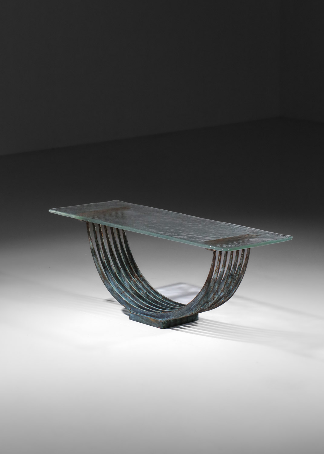 petite table basse console en acier patiné et dalle de verre brutaliste