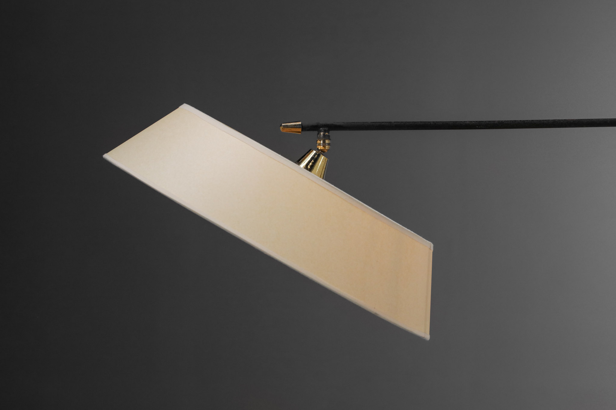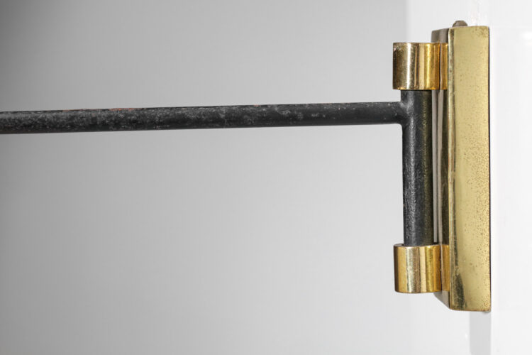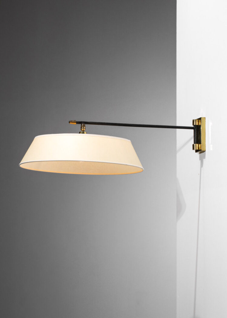 Potence des années 50 éditée par la Maison Arlus. Bras en métal laqué noir, attache murale et rotule de l’abat-jour en laiton massif. Possibilité d’orienter l’abat-jour selon l’envie grâce à la rotule (Cf photos). Très bel état vintage général, ampoule recommandée B22, abat-jour refait à neuf sur mesure en tissu.