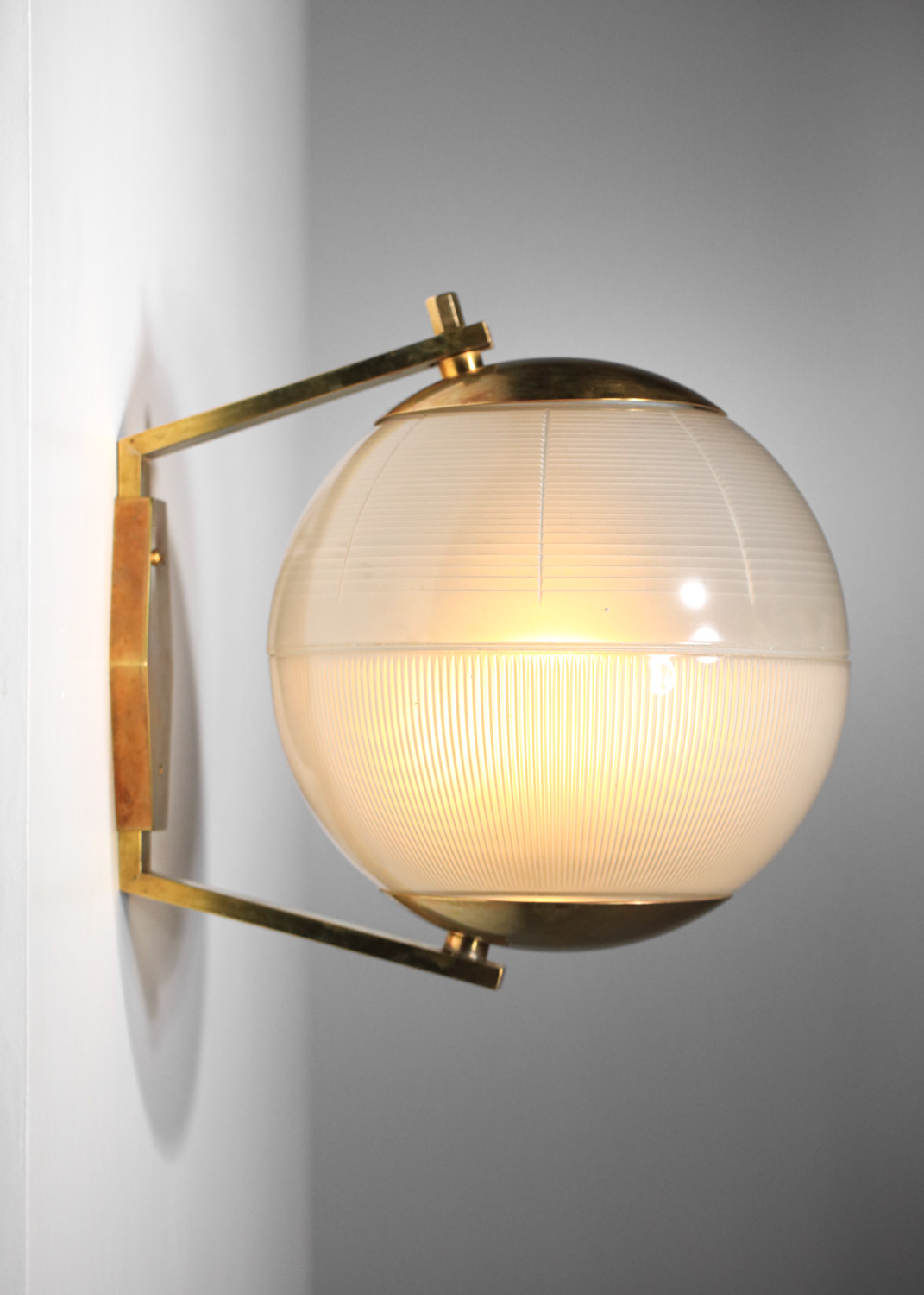 Rare applique italienne de années 60 éditée par Stilnovo. Structure en laiton massif, diffuseur formé avec deux verres en demie sphère striés et opaques. Design original et très décoratif. Bel état vintage, à noter des traces du temps et d’utilisation (voir photos). Système électrique d’origine, nous recommandons une ampoule LED type E27.
