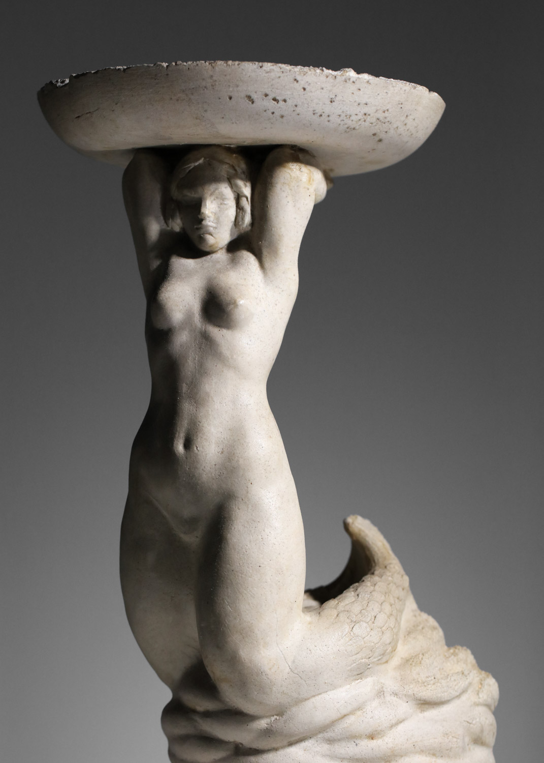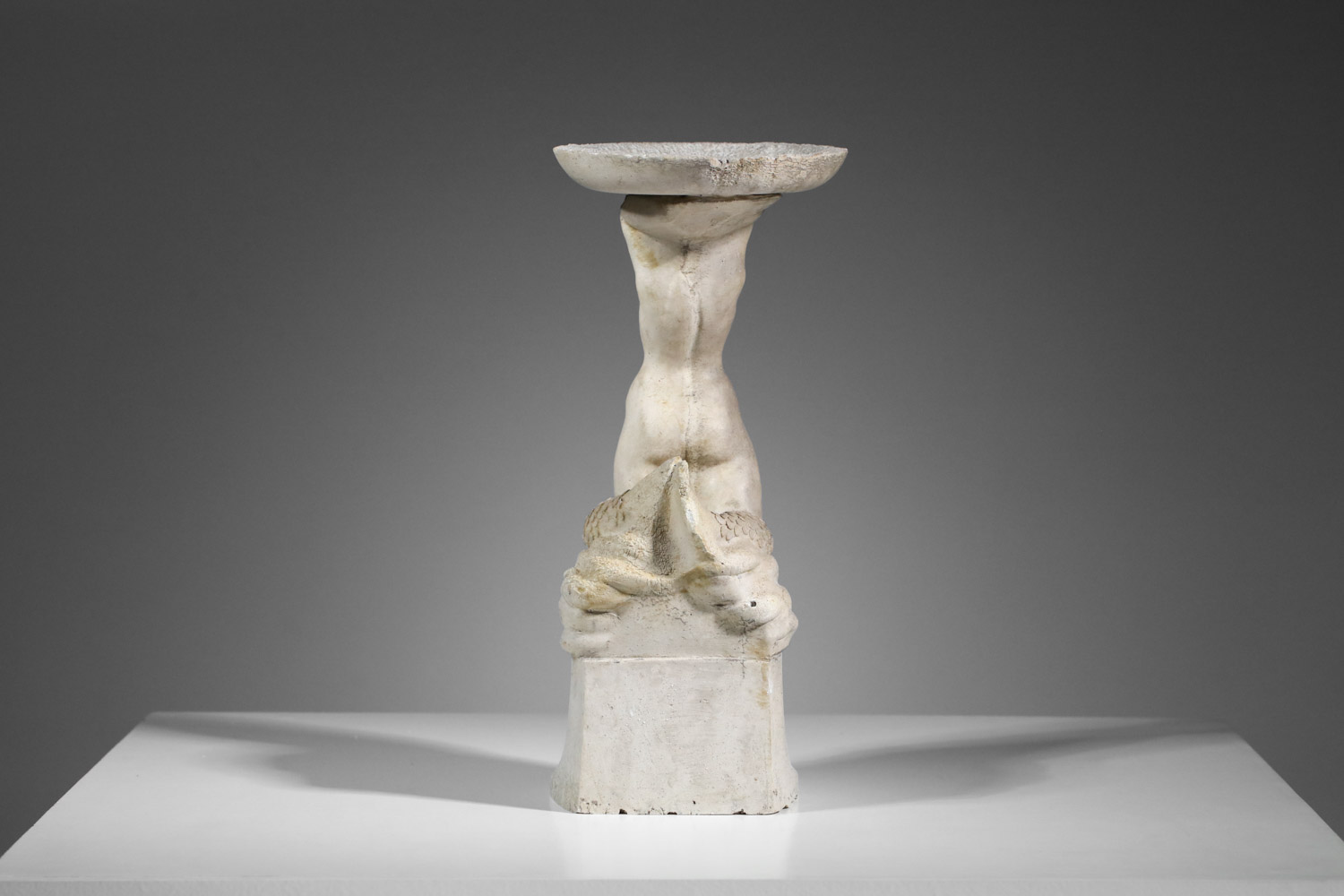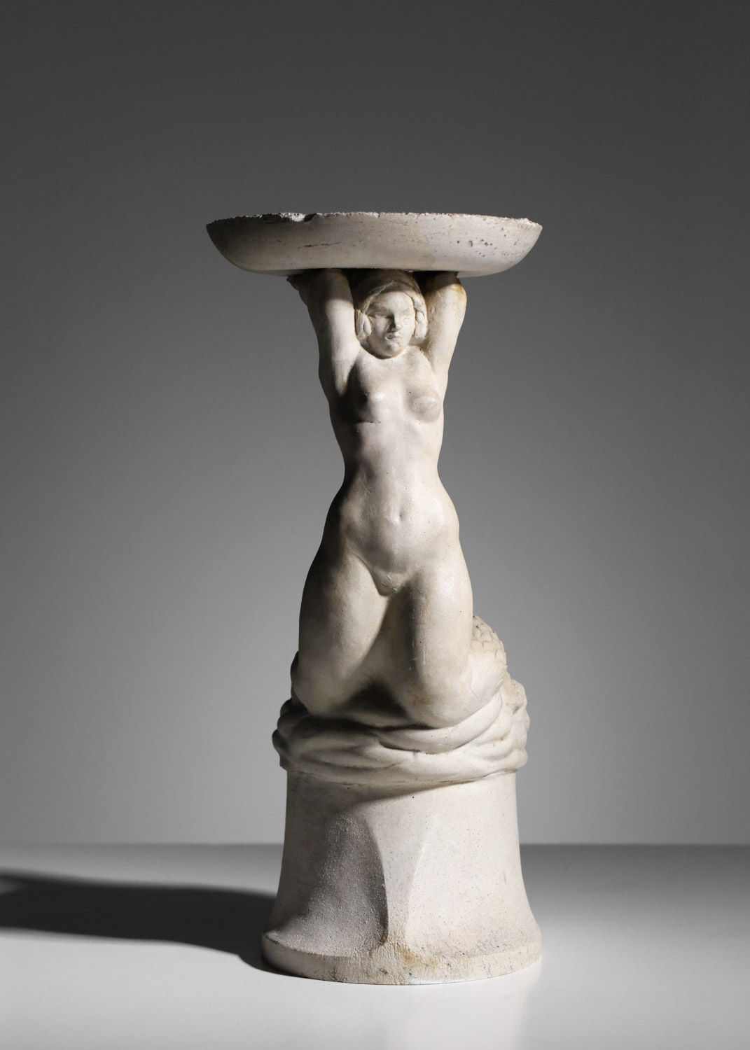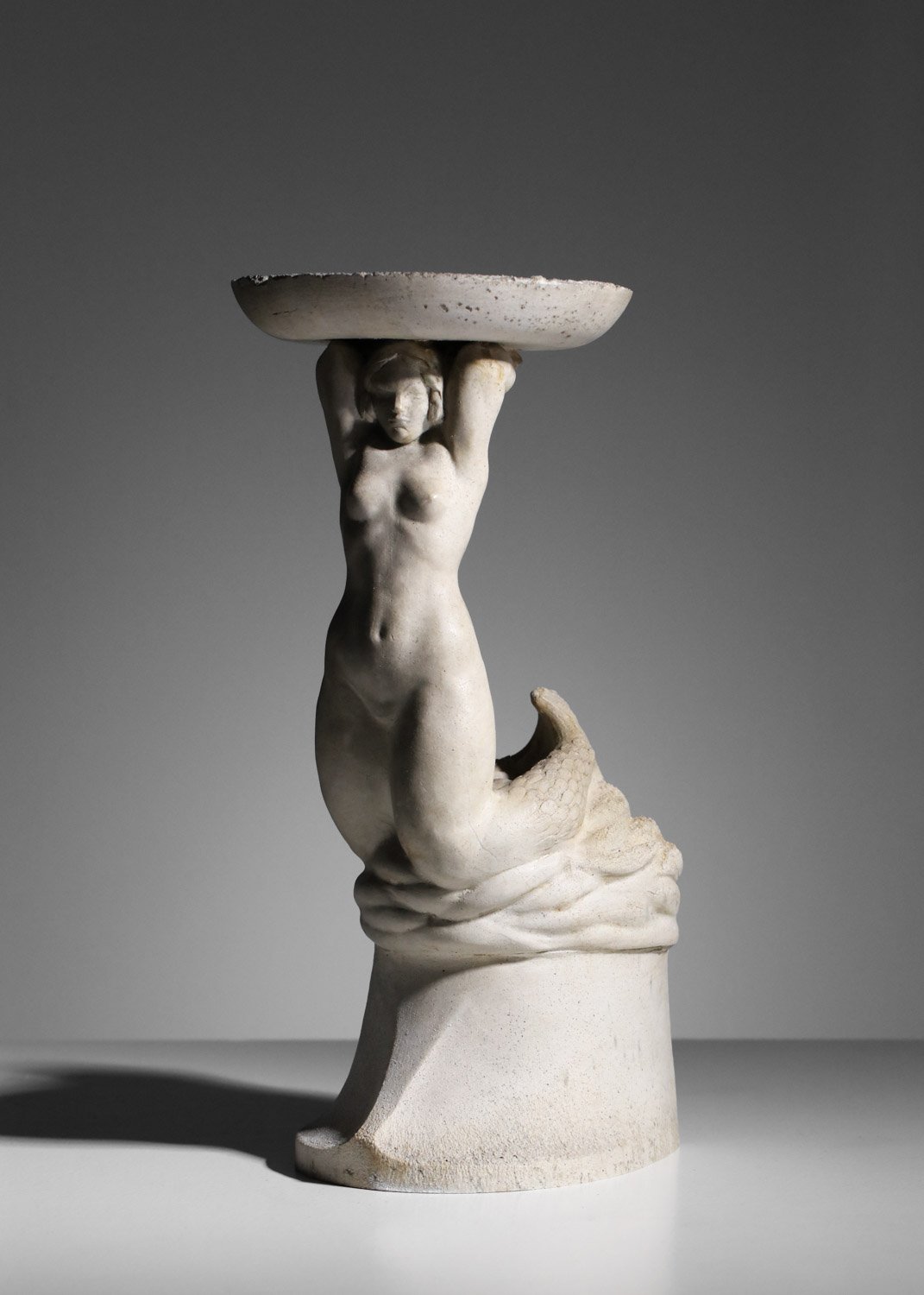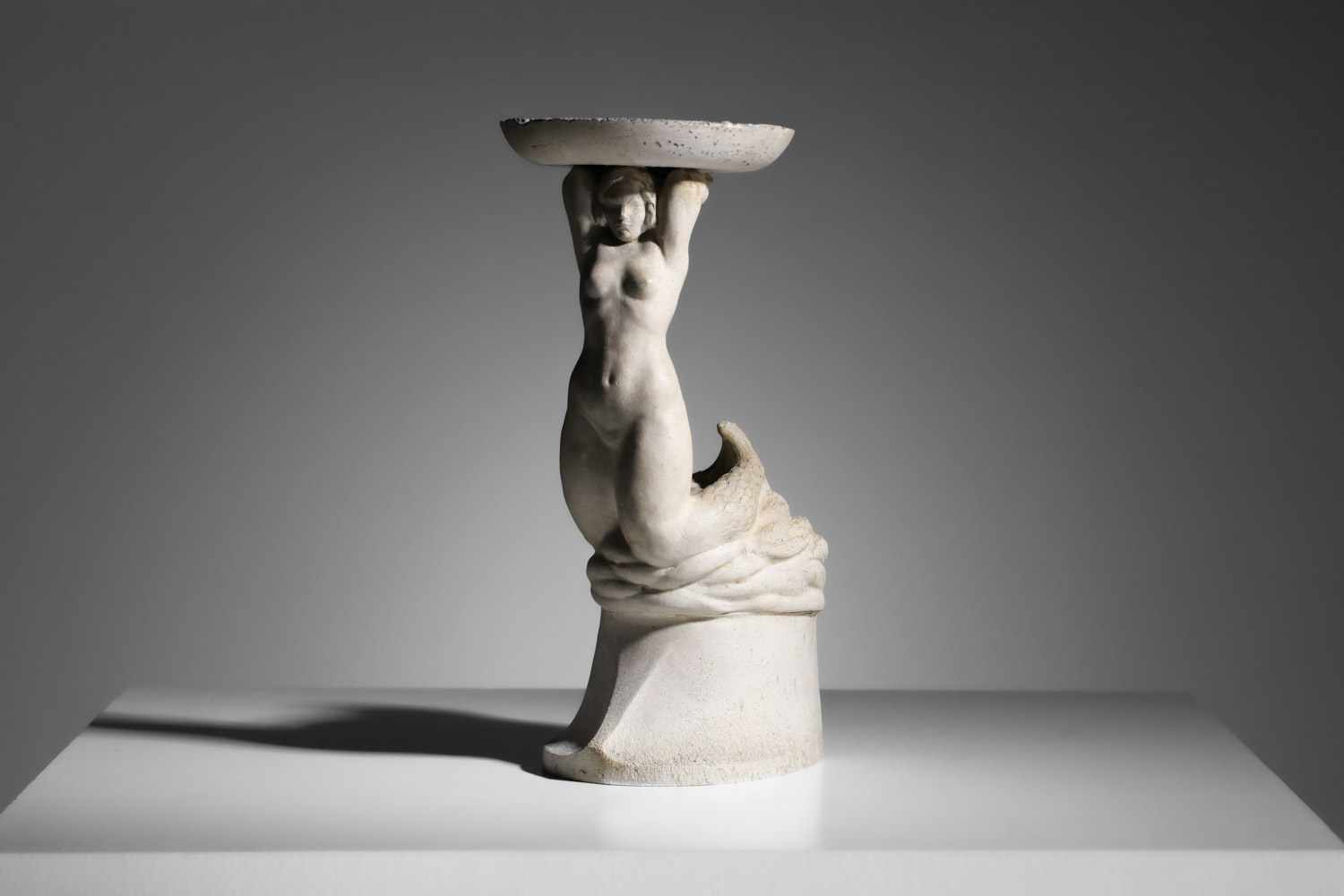 Sculpture de l’artiste italien Giorgio Rossi des années 40. Entièrement en plâtre patiné représentant une sirène portant un plateau. Bel état vintage avec une très jolie patine du temps sur la matière. À noter de nombreuses traces d’utilisation et du temps ainsi que des petits éclats (voir photos).