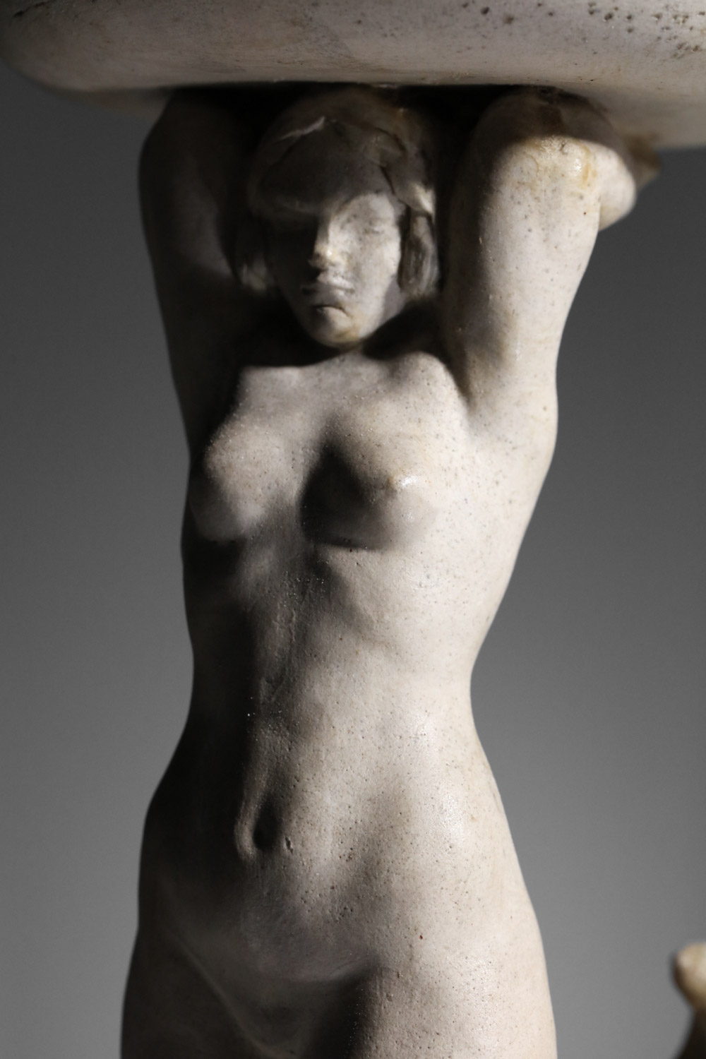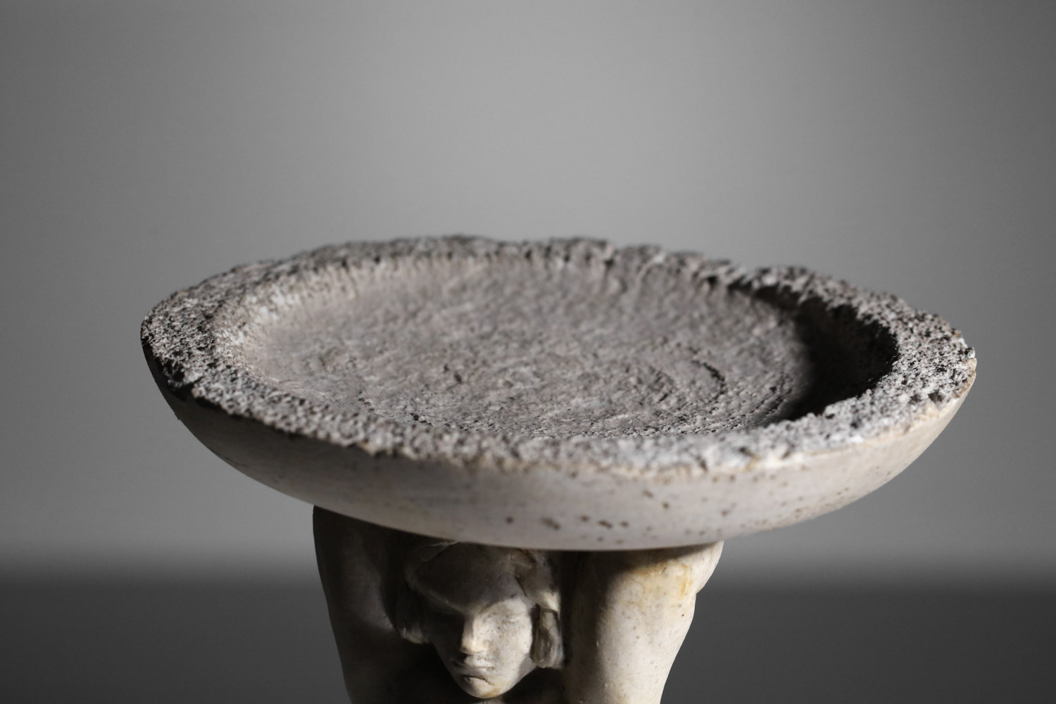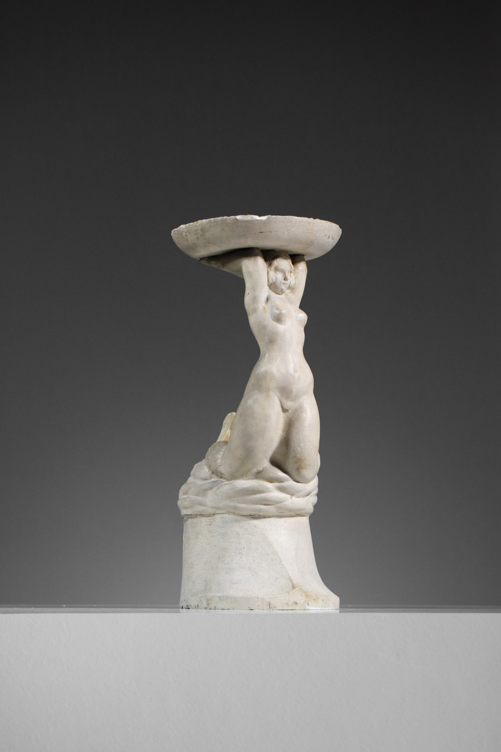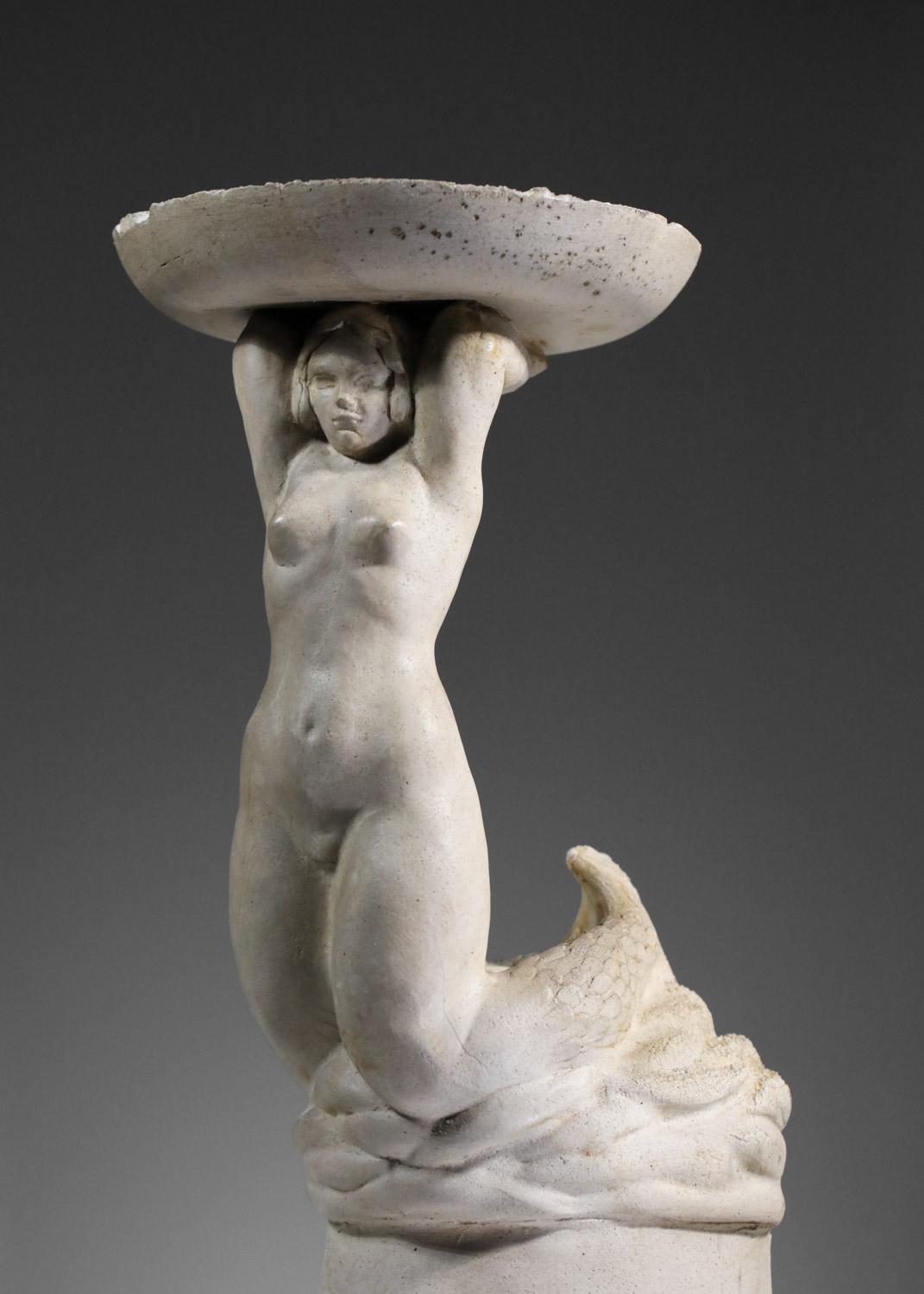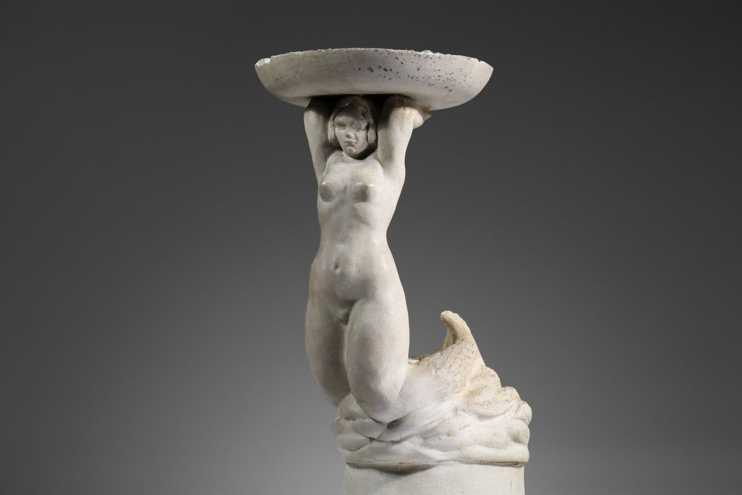 Sculpture de l’artiste italien Giorgio Rossi des années 40. Entièrement en plâtre patiné représentant une sirène portant un plateau. Bel état vintage avec une très jolie patine du temps sur la matière. À noter de nombreuses traces d’utilisation et du temps ainsi que des petits éclats (voir photos).