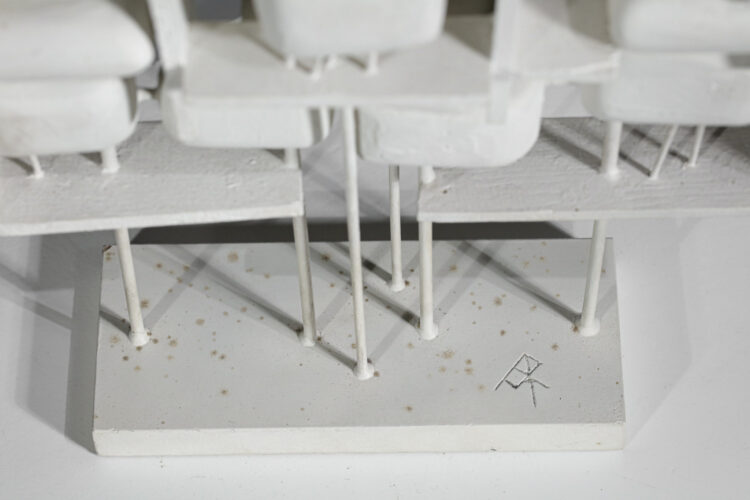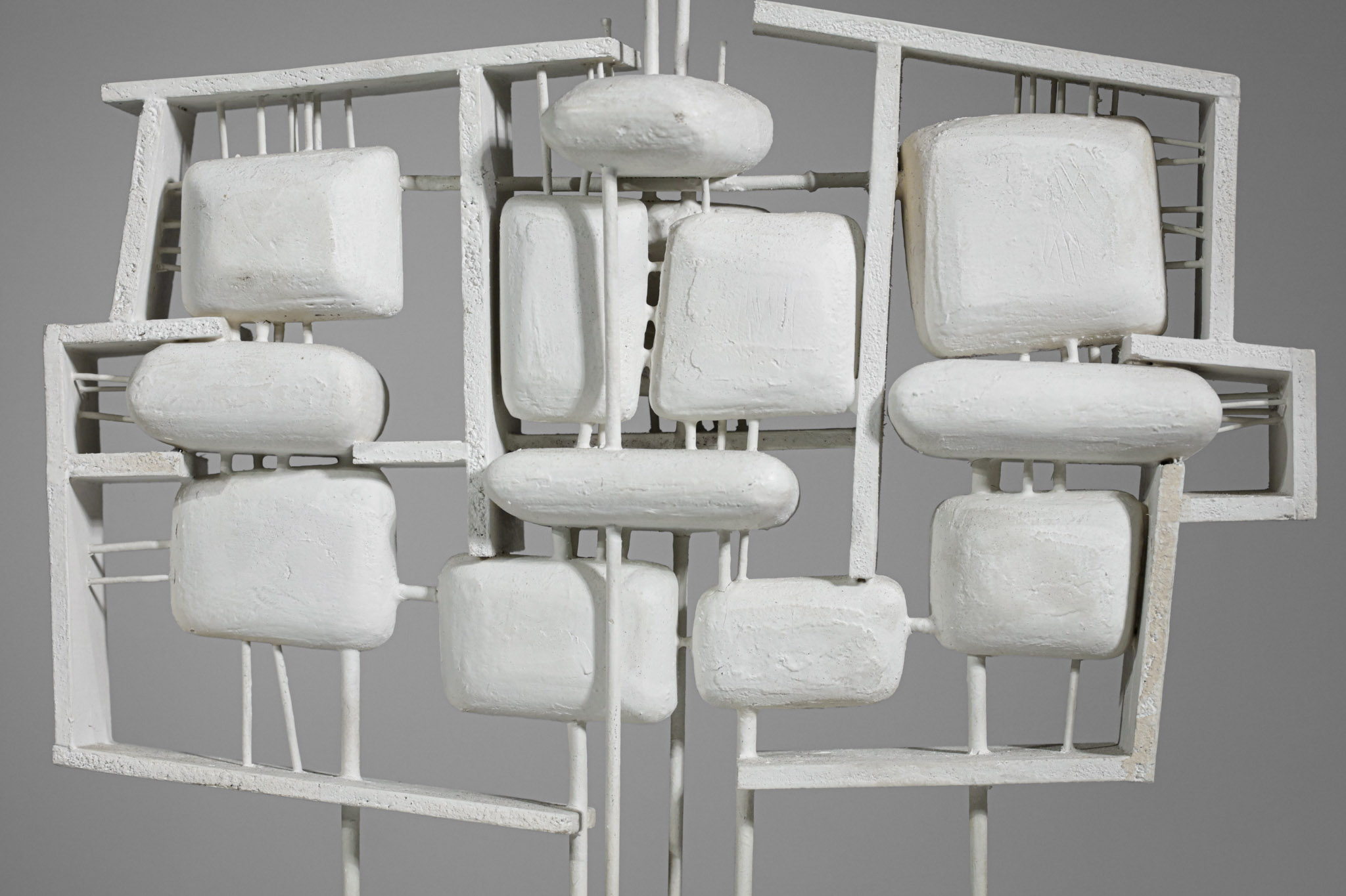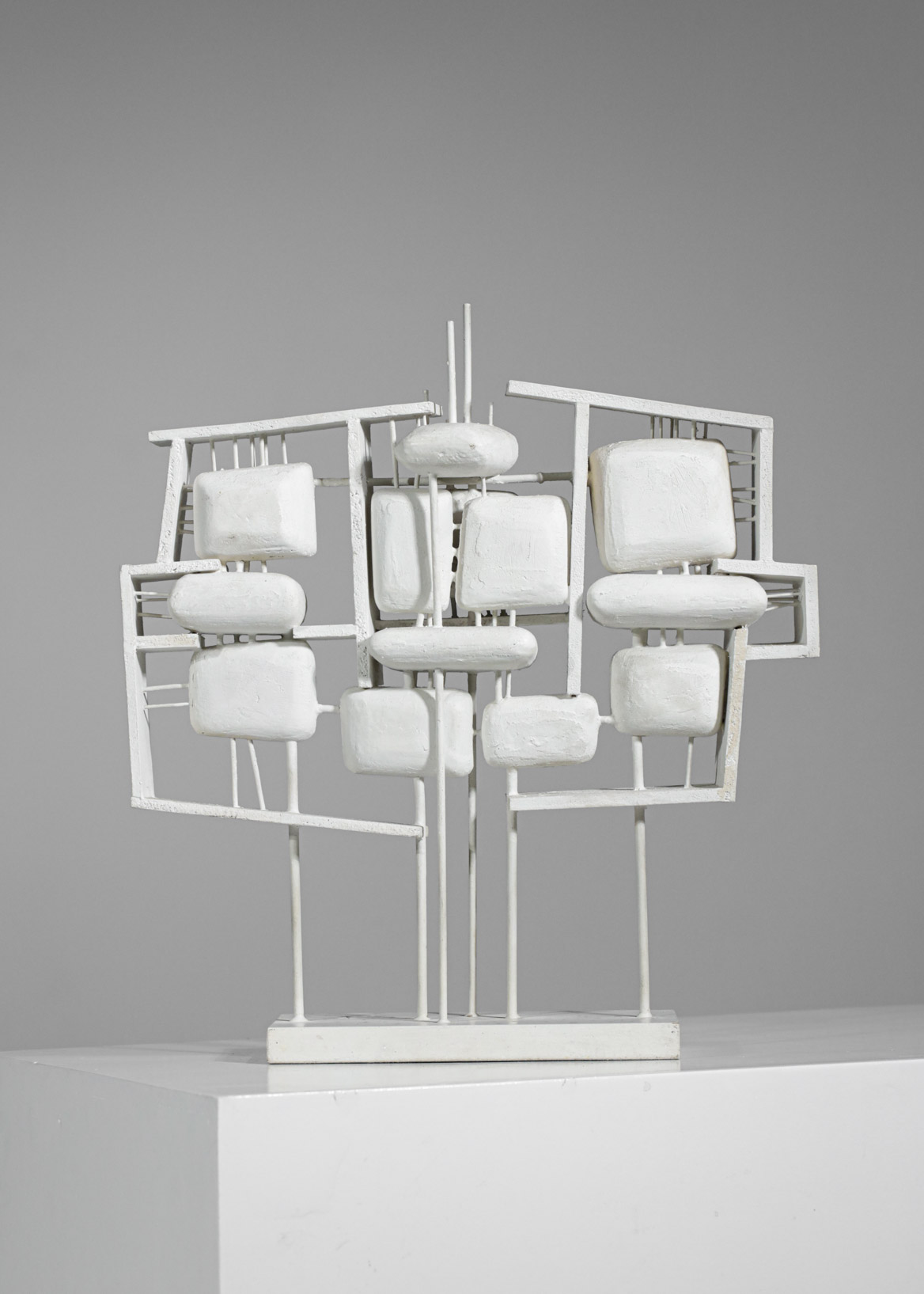 Sculpture française très originale, petites proportions, réalisée avec une technique d’assemblage de bois et de métal laqué blanc le tout enrobé de plâtre dans un style moderniste. Artiste inconnu, présence de la signature sur le socle. Excellent état de conservation, à noter quelques traces du temps sur le socle (cf photos).