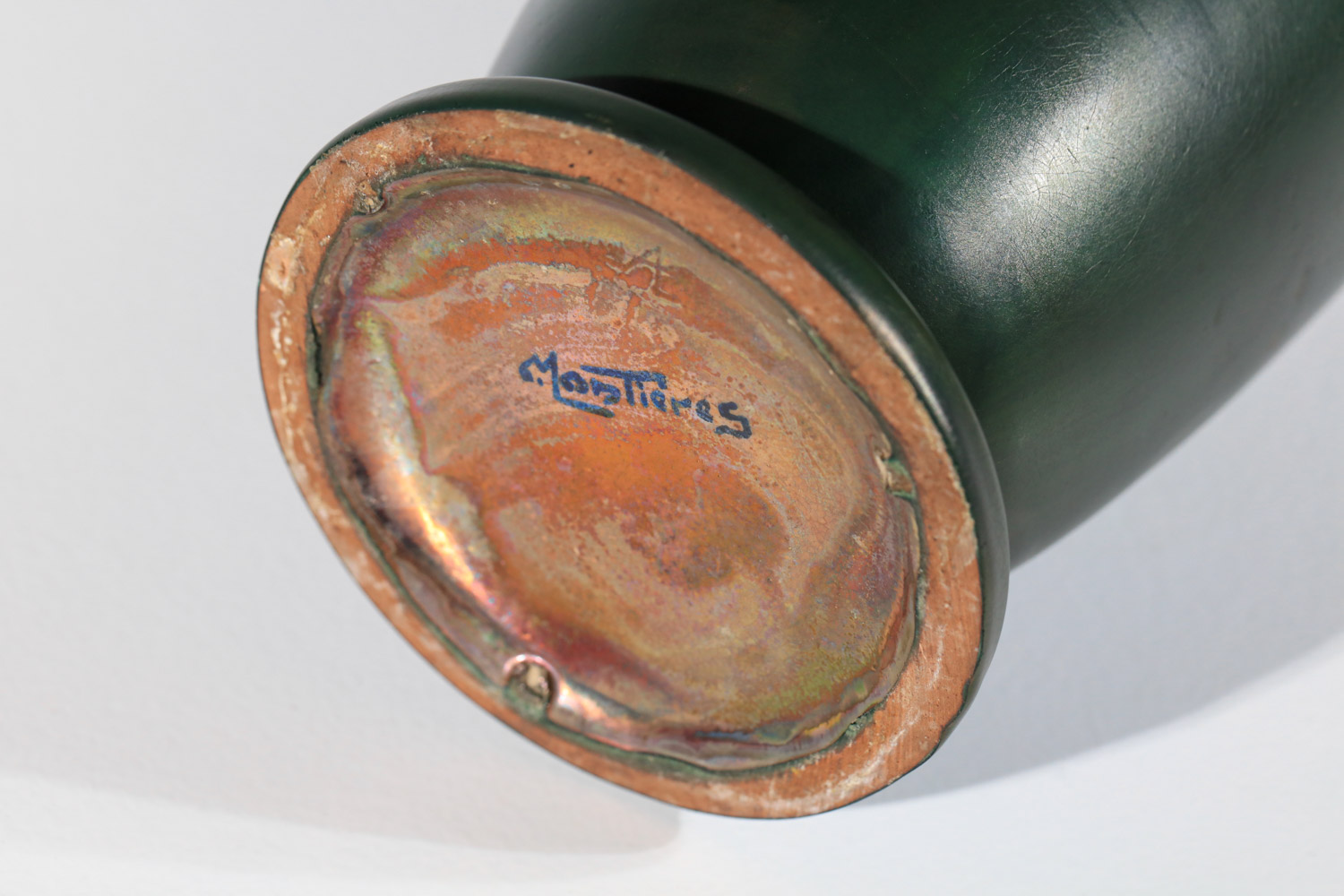 Vase Art nouveau du fabricant français Montières, datant des années 1930. Entièrement en céramique, il présente un décor floral sur la partie supérieure et une finition cloisonnée irisée. En très bon état vintage, avec un léger défaut de fabrication (voir photo). La signature de la manufacture est présente sous la base du vase.